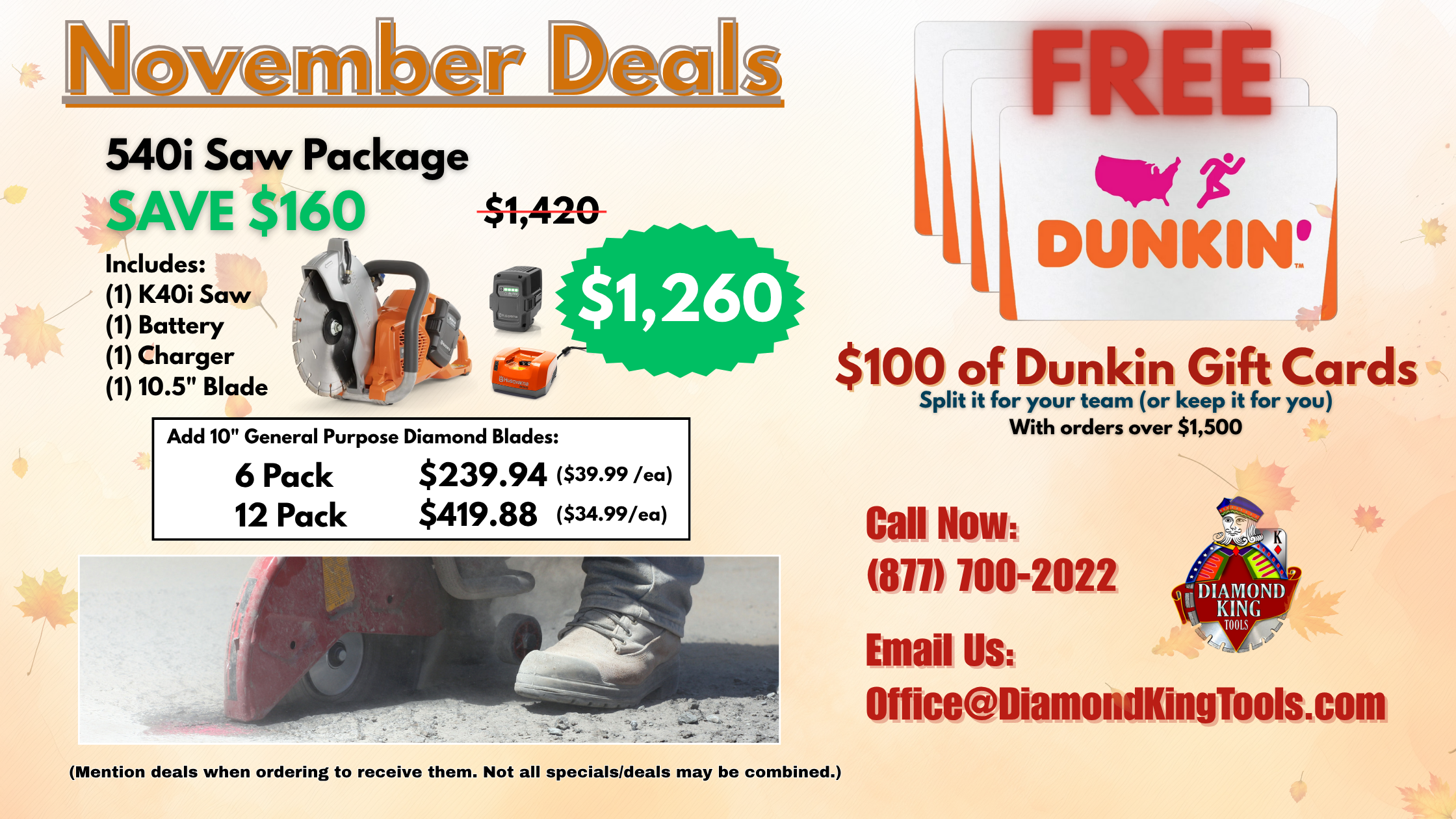 November is here, and Diamond King Tools is kicking off the season with exclusive savings and free rewards for hardworking pros. Whether you’re cutting concrete, asphalt, or stone, these deals are built to keep your jobs running smoothly—and your crew running on Dunkin’!